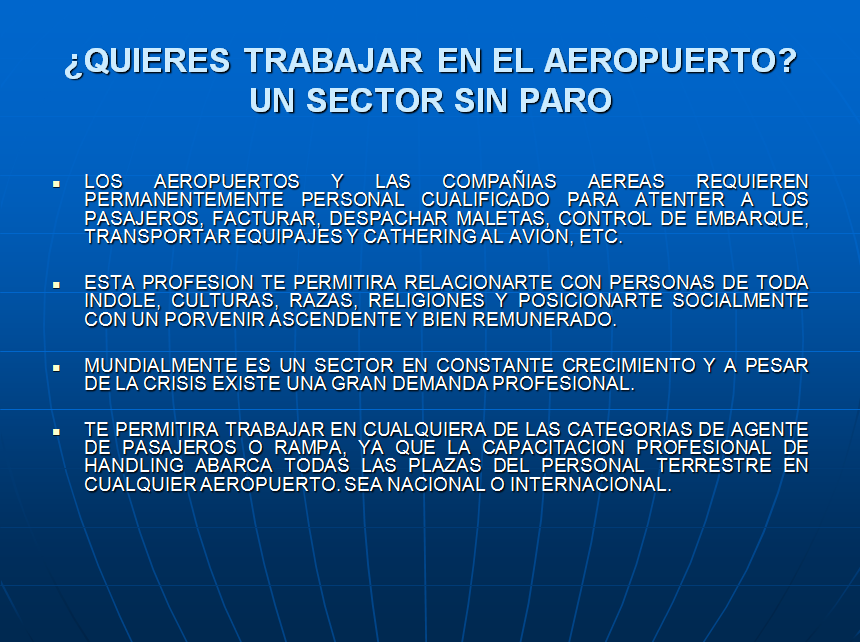 Los aeropuertos y las compañías aéreas requieren permanentemente personal cualificado para atender a los pasajeros, facturar, despachar maletas, control de embarque, transporte de equipajes y catering al avión, etc.